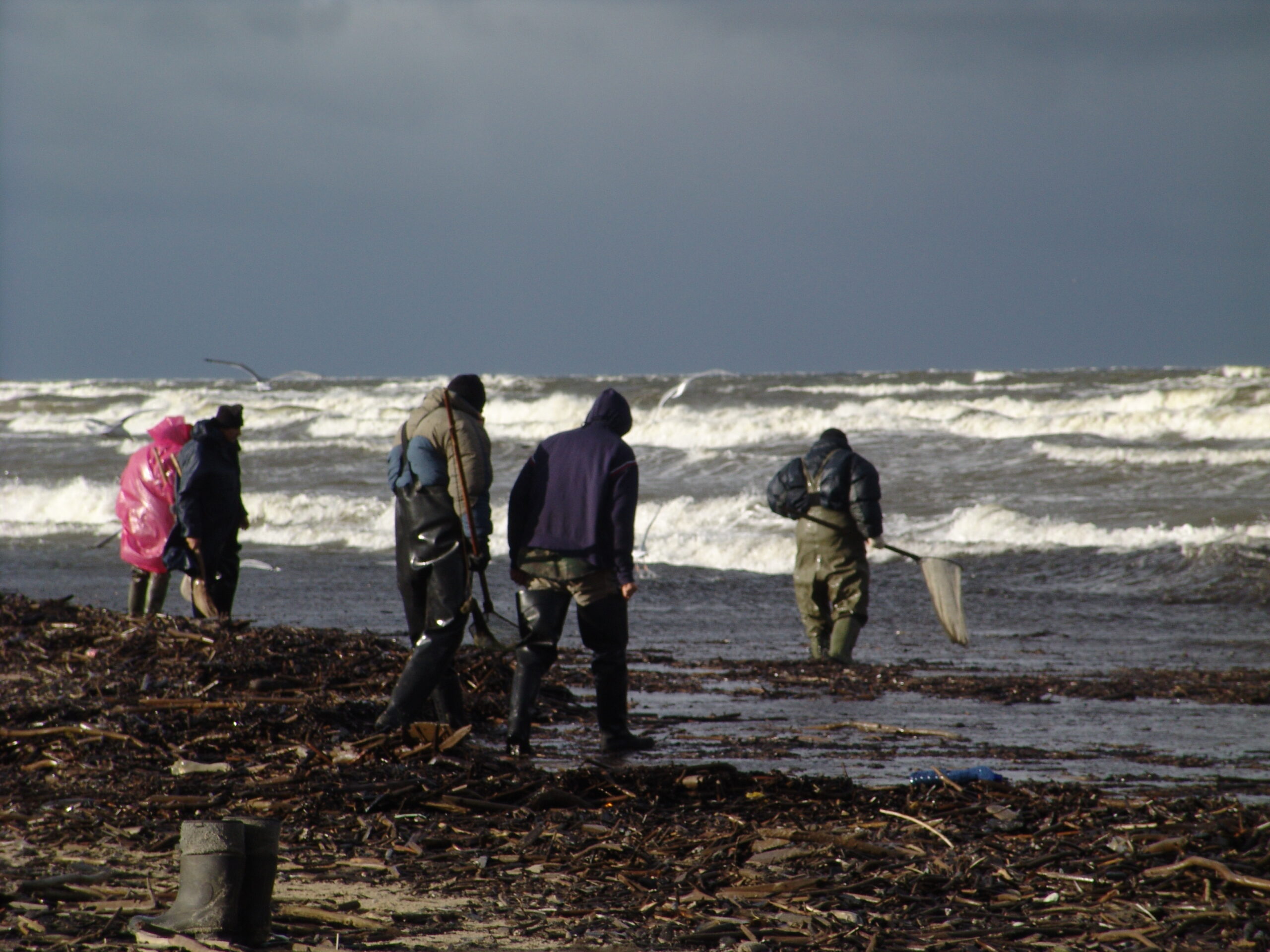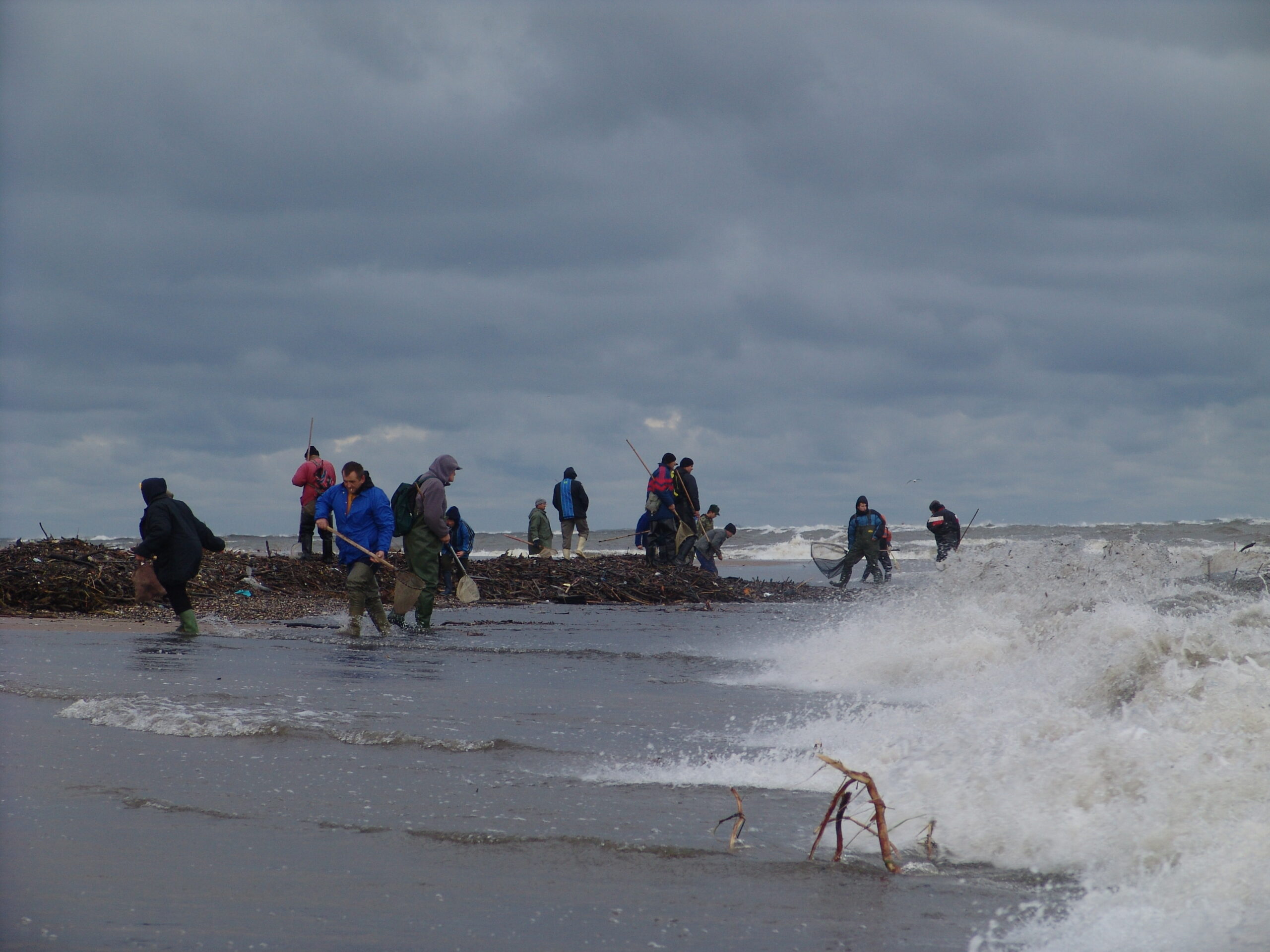 Gdy sztorm zaczyna cichnąć, a mewy kołują nad falami[3] i zaczyna wyrzucać patyki[4] bursztyniarze pilnie wypatrują śmieci[5]. Wyrzucane patyki mogą okazać się starymi śmieciami, pochodzącymi z poprzedniego sztormu i są już przebrane. Śmieci te, gdy morze