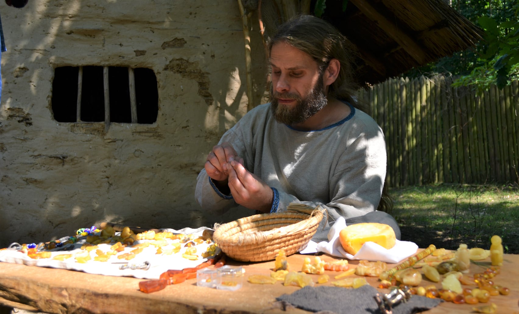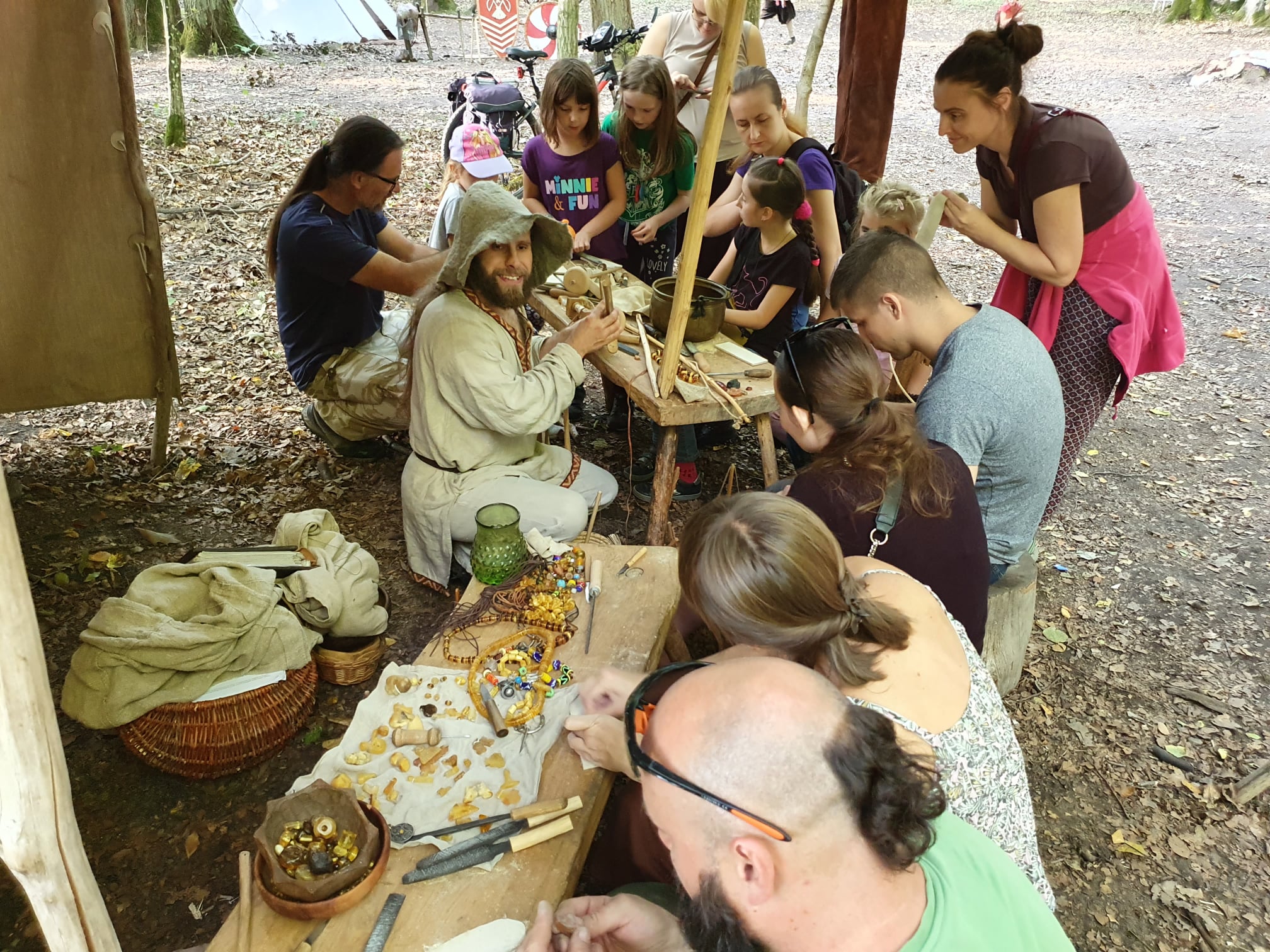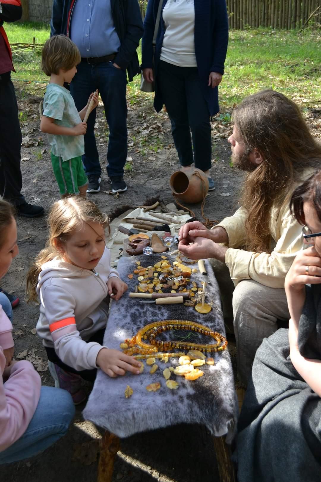 W trakcie pokazu widzowie mogą próbować wiercić bursztyn lub opiłować narzędziami wzorowanymi na zamówionym okresie historycznym.