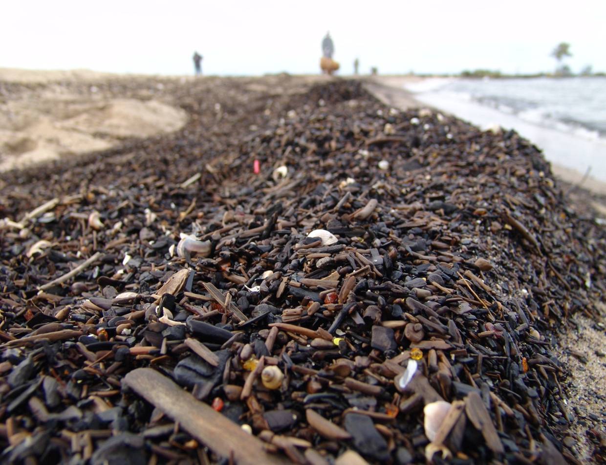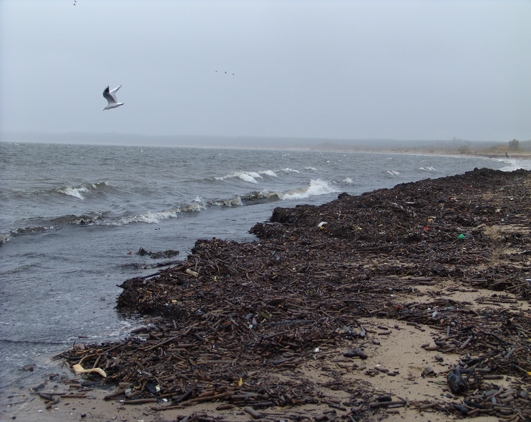 [2] stare śmieci – już podczas poprzedniego sztormu były wyrzucane, a charakteryzować je mogą np. but damski na obcasie o kolorze różowym i kurtka fioletowa ortalionowa, natomiast nowe śmieci charakteryzują inne odpady typu np. kalosz czerwony i fragmenty potłuczonej plastikowej boi pomarańczowej.