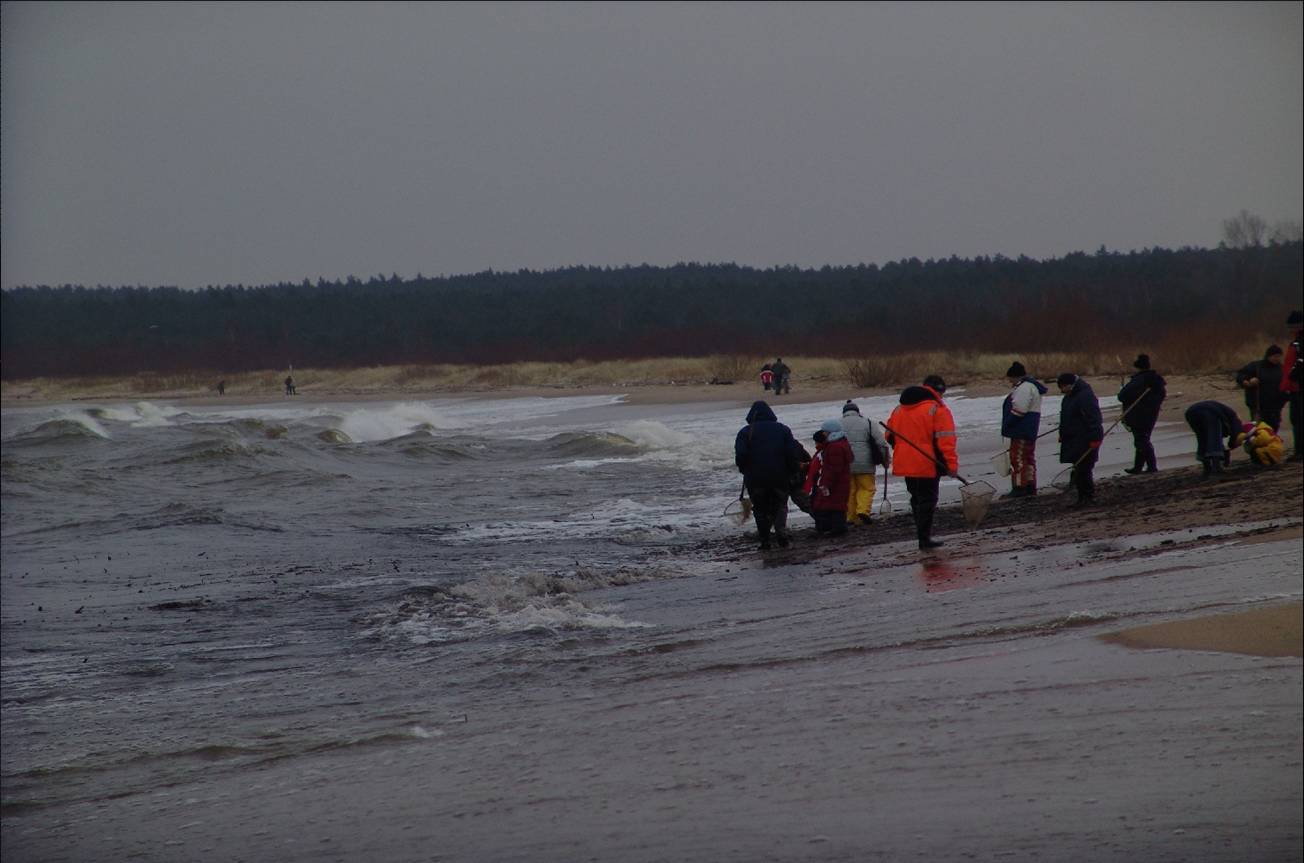 [5] Z zapisu z roku 1762 wiemy, iż bursztyn „…Poszukuje się pomiędzy rzeczami wyrzuconymi przez morze, a także ludzie wchodzą do wody, niosąc na szyi rodzaj torby i mając w ręku żerdź , do końca której przymocowana jest siatka w formie kieszeni. Wodzą tym przyrządem w wodzie aż natrafią na jakiś kawałek, wtedy wkładają go do torby zawieszonej na szyi. Bursztyn wyrzucany na brzeg morza jest wymieszany z małymi źdźbłami butwiejącego drewna i zwykle kawałki są niezbyt wielkie. Duże kawałki łowi się, są one rzadko znajdowane na plaży” (J. Popiołek 2006, s. 210). Obecnie torbę na szyi zastępuje się kieszenią lub, bardzo sporadycznie, małym woreczkiem. Zapis z roku 1821/1822 głosi, iż najwięcej bursztynu występuje „jeżeli woda morska przy brzegach napełni się gęsto porostami, a najbardziej jeżeli wyrzuca kawałki zaokrąglone gniłego drzewa” (J. Popiołek 2006, s. 68). Wzmianka z roku 1876 mówi, iż „…rybacy wiążą się linami, aby rozigrane morze nie rozerwało szeregu i nie pochłonęło którego z nich, i wspierając się na długich żerdziach swoich sieci, przeskakują spienione grzbiety wzdętych bałwanów” (J. Popiołek, 2006, s. 73). Obecnie z tego co mi wiadomo rybacy nie wiążą się ani nie przeskakują ponad falami. Na podstawie tych dwóch sposobó połowu rozróżniało się metodę zwaną „das Schöpfen” oraz „das Lesen” (W. Długokęcki 1996, s. 128).