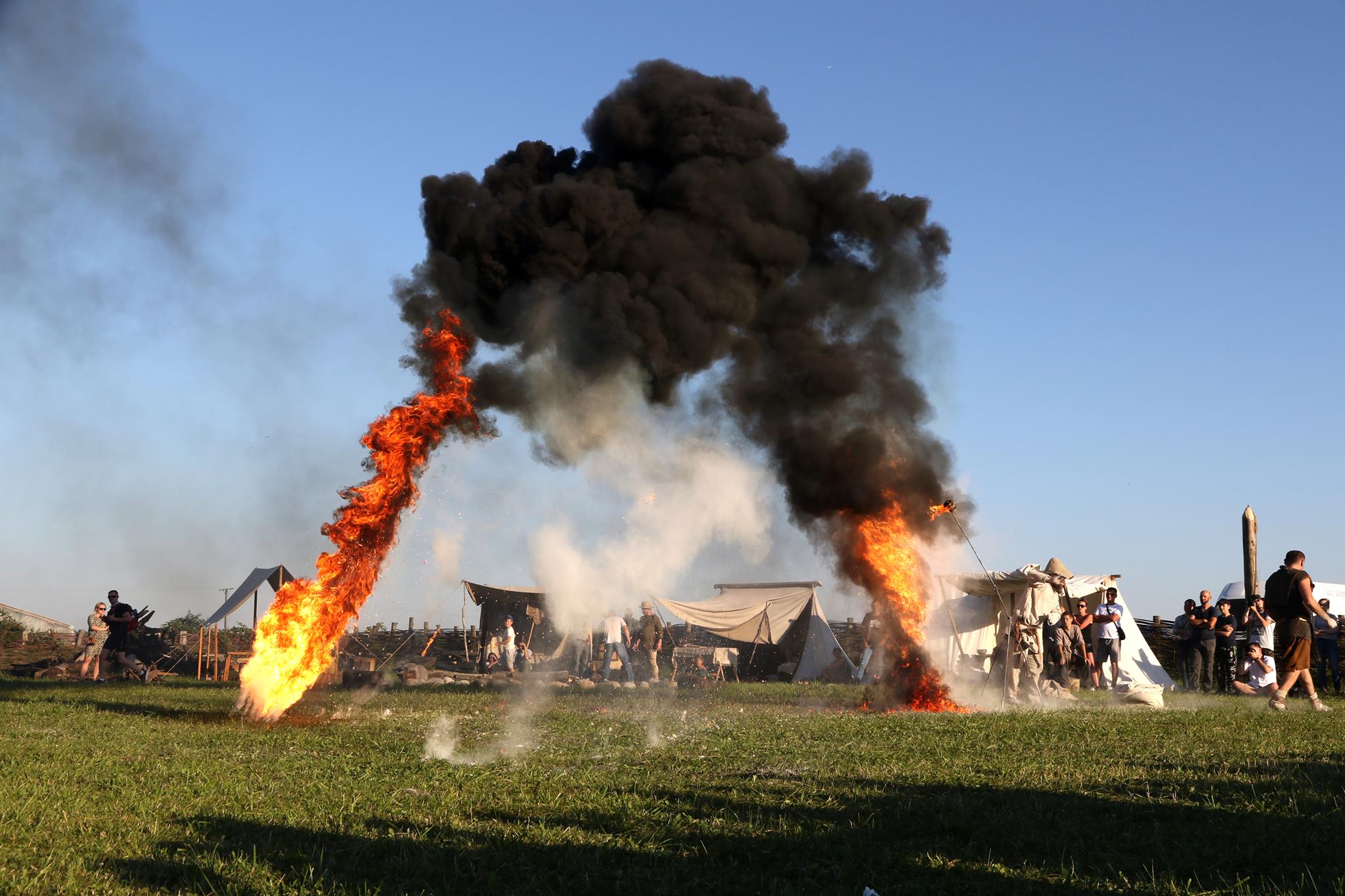 Na kilku naumachiach, podczas pokazów z udziałem drewnianych drakarów i snekkera, udało się uzyskać złudzenie, że woda pali się miejscami to nie było złudzenie, po prostu były to skupiska pyłu bursztynowego z fajerboli, które zakończyły lot przedwcześnie na powierzchni wody (pył bursztynowy jest lżejszy od wody i utrzymuje się na jej powierzchni),